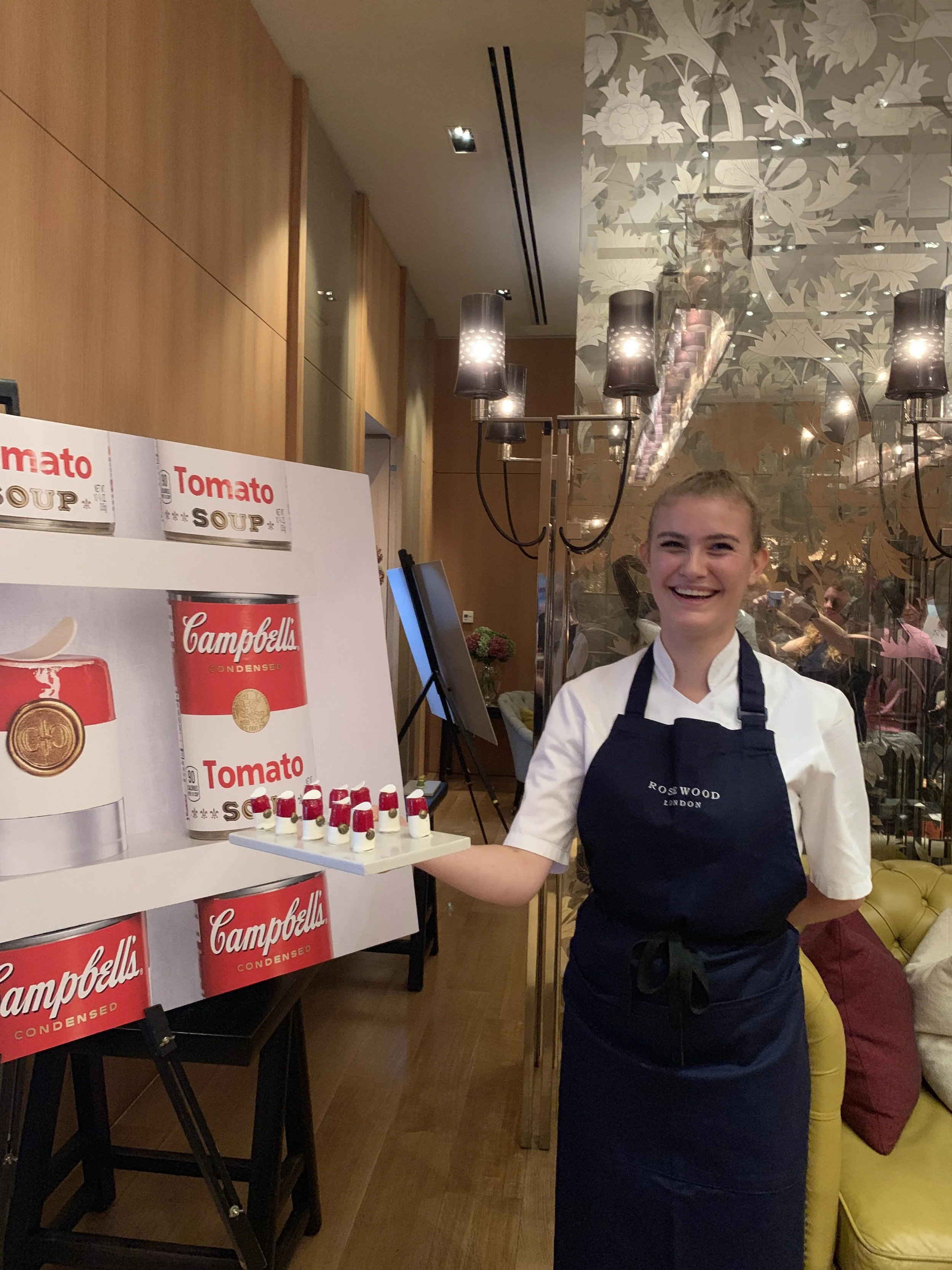A smiling woman dressed in a white shirt and navy apron standing in a restaurant or cafe, presenting a tray of small desserts with red topping, in front of a large poster with Campbell's tomato soup cans displayed in a pop art style.